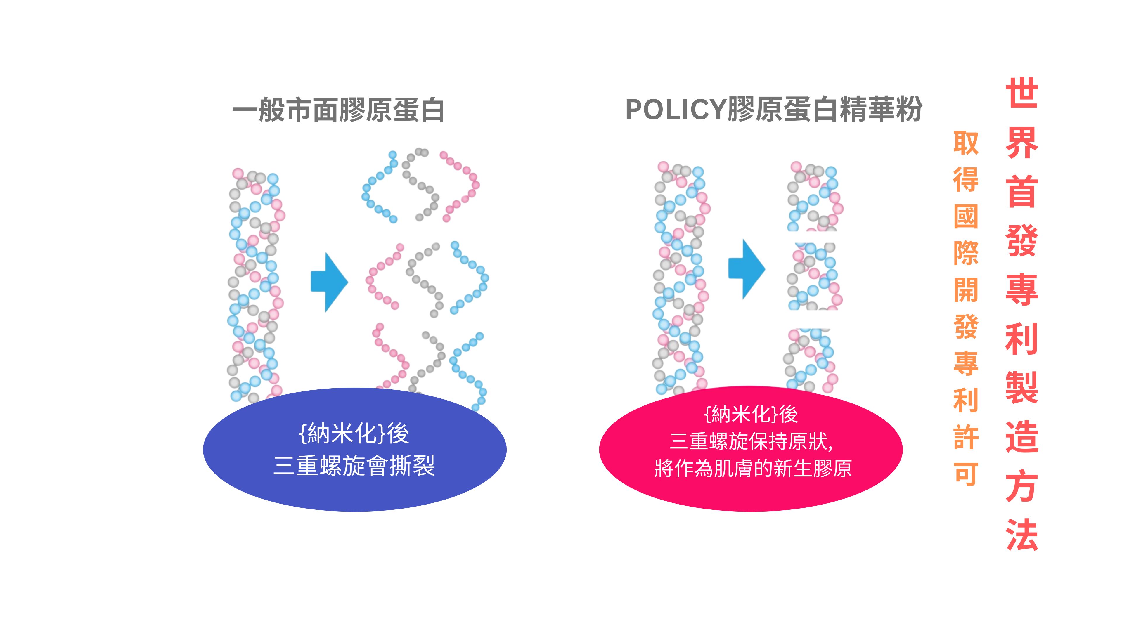 . 與人體{三重螺旋結構}的膠原蛋白 一樣, 膠原蛋白精華粉保持原狀,作為肌膚的新生膠原
